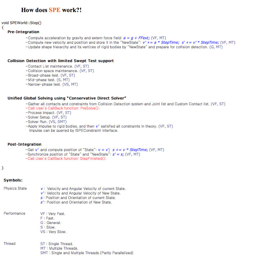Define some global variables.Ready for physics simulation.// Function to initialize a shape from D3DXMeshvoid InitShape(ISPEShape* pShape, ID3DXMesh* pMesh) { BYTE *pVB; void *pIB; pMesh->LockVertexBuffer(D3DLOCK_NOSYSLOCK, (void**)&pVB); pMesh->LockIndexBuffer (D3DLOCK_NOSYSLOCK, (void**)&pIB); if(pMesh->GetOptions() & D3DXMESH_32BIT) // 32BIT index { pShape->Initialize (pVB, pMesh->GetNumBytesPerVertex (), (int*)pIB, pMesh->GetNumFaces ()); } else // 16BIT index { pShape->Initialize (pVB, pMesh->GetNumBytesPerVertex (), (WORD*)pIB, pMesh->GetNumFaces ()); } pMesh->UnlockVertexBuffer (); pMesh->UnlockIndexBuffer (); } void InitApp() { D3DXLoadMeshFromX ("box.x", &pBoxMesh); // load a model from x file pWorld = CreateSPEWorld(); // create a instance of physics world pWorld->SetGravity (SPEVector(0, -9.8f, 0)); // set the gravity LPSPESHAPE pShape = pWorld->CreateShape(); // create a shape instance InitShape(pShape, pBoxMesh); // initialize the shape pBody = pWorld->AddRigidBody (pShape); // add a rigid body to SPEWorld with this shape pBody->SetPosition (SPEVector(0.0f, 2.0f, 0.0f)); // set position of rigid body pBody->SetVelocity (SPEVector(0.0f, 0.0f, -5.0f)); // set velocity pBody->SetAngularVelocity (SPEVector(0.0f, 25.0f, 0.0f)); pWorld->ReleaseShape(pShape); // release the shape // another way to add a rigid body is to use "Shape" which is a member of pWorld, it had // been created when the pWorld was created. e.g. // InitShape(pWorld->Shape, pBoxMesh); // pBody = pWorld->AddRigidBody (); // you needn't pass any parameter if you want to add a rigid body by "Shape" , and needn't release it // it can be Re-Initialize too.} Update the physics world. void CALLBACK OnFrameMove(float fElapsedTime ) { pWorld->Update(fElapsedTime); }